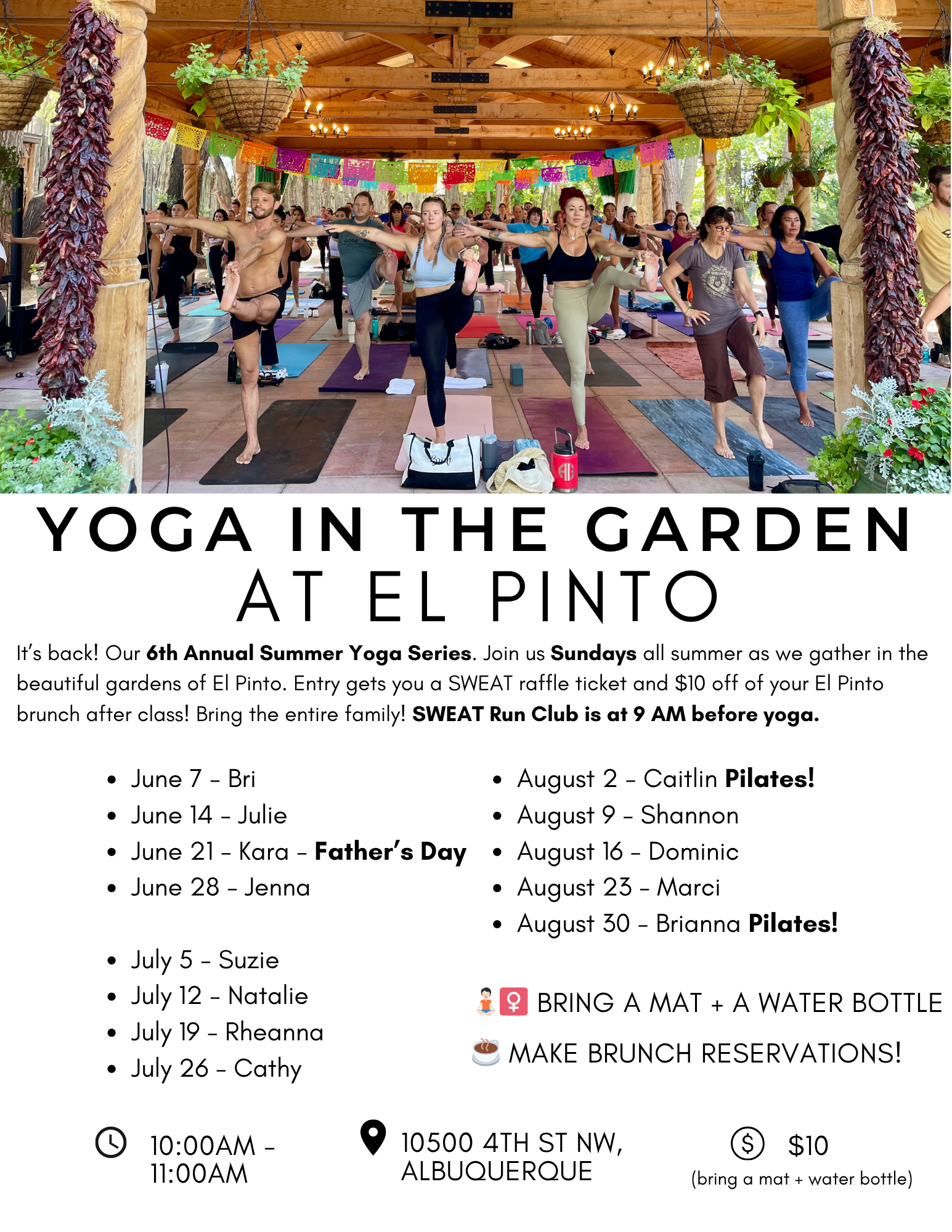 Join us all summer long as we gather to practice in the fresh air and beautiful gardens of El Pinto Restaurant. Their beautiful pavilion is surrounded by lush trees, grass, wisteria vines, and flowers; the perfect shady yoga spot to practice with all of your favorite SWEAT teachers.